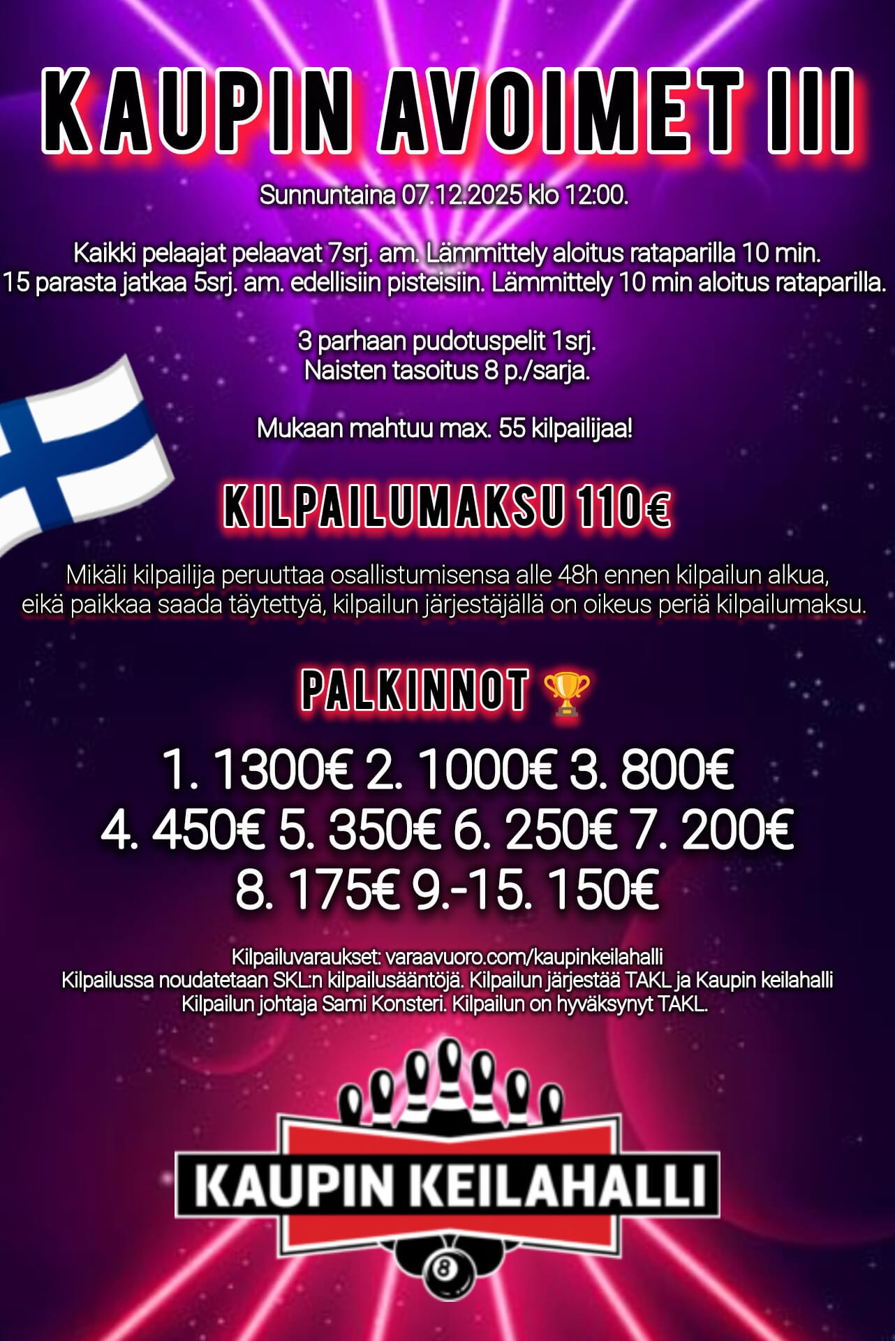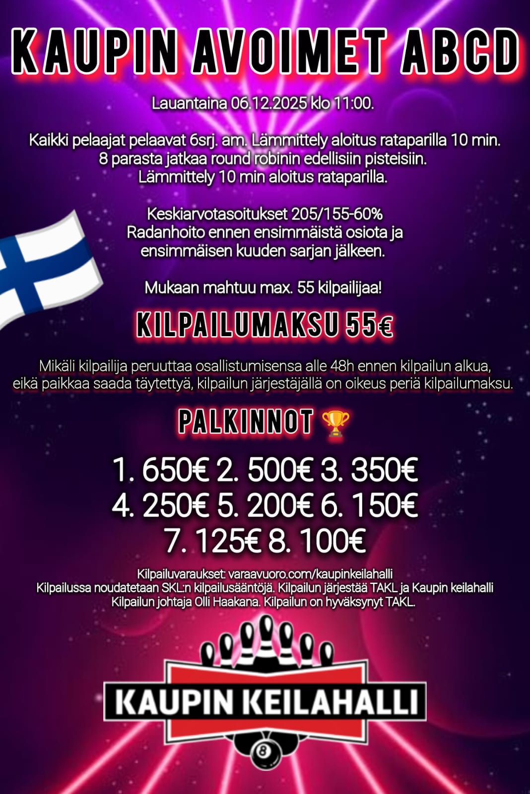 9 PIN NO-TAP KISAILMOITUS | olosuhde sama kuin kesäkilpailussa | Finaali maanantaina 18.8. klo 17.30 |